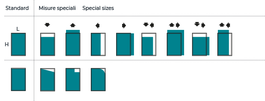 I MOBILI CON ANTE POSSONO ESSERE MODIFICATI RIDUCENDO LE MISURE IN LARGHEZZA, ALTEZZA E PROFONDITÀ CON UN SOVRAPPREZZO DEL 15% PER OGNI MISURA MODIFICATAI mobili con cassetti possono essere modificati con specifica richiesta all'ufficio tecnico per lo studio della fattibilità sul tipo di mobile scelto. La modifica delle misure del mobile richiede un supplemento di tempo per la produzione di 2 settimane