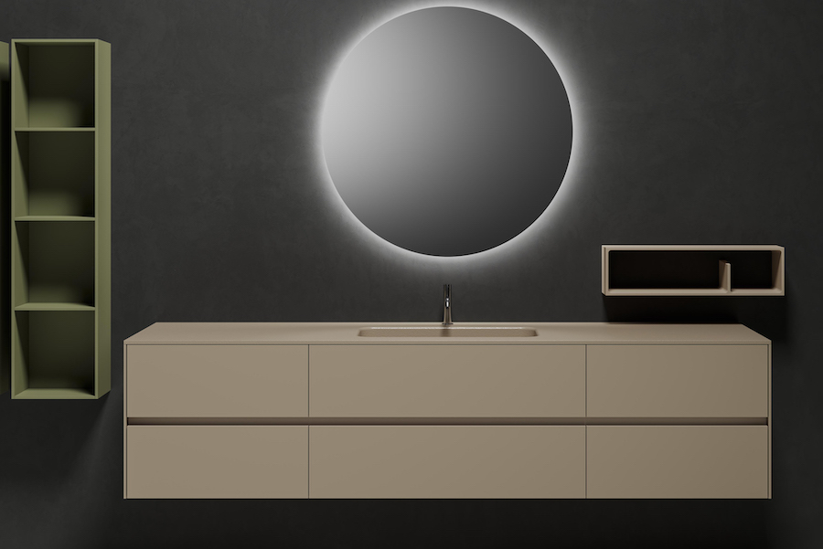 Materiale composito costituito da carbonato di calcio, magnesio e resina poliestere. La finitura superficiale è liscia e non presenta alcuna giunzione, è quindi resistente, facile da pulire e dall’aspetto pulito e lineare. Disponibile nei colori Bianco Opaco e Bianco Lucido.