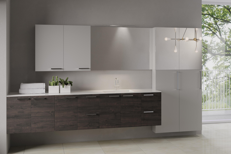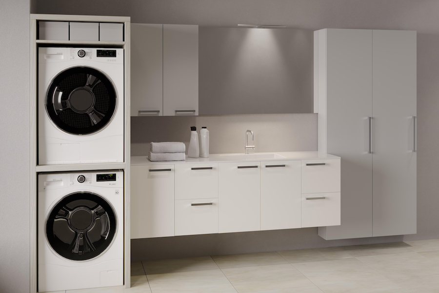 materiale composito costituito da allumina e resina acrilica. Finitura superficiale liscia e assenza di giunzioni rendono il materiale resistente e facile da pulire, ideale per l'ambiente lavanderia, disponibile nel colore bianco opaco