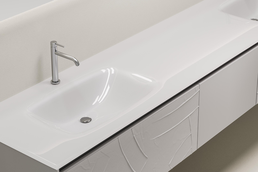 materiale composito costituito da carbonato di calcio, magnesio e resina poliestere. La finitura superficiale è liscia e non presenta alcuna giunzione, è quindi resistente, facile da pulire e dall’aspetto pulito e lineare. Disponibile nei colori bianco opaco e bianco lucido